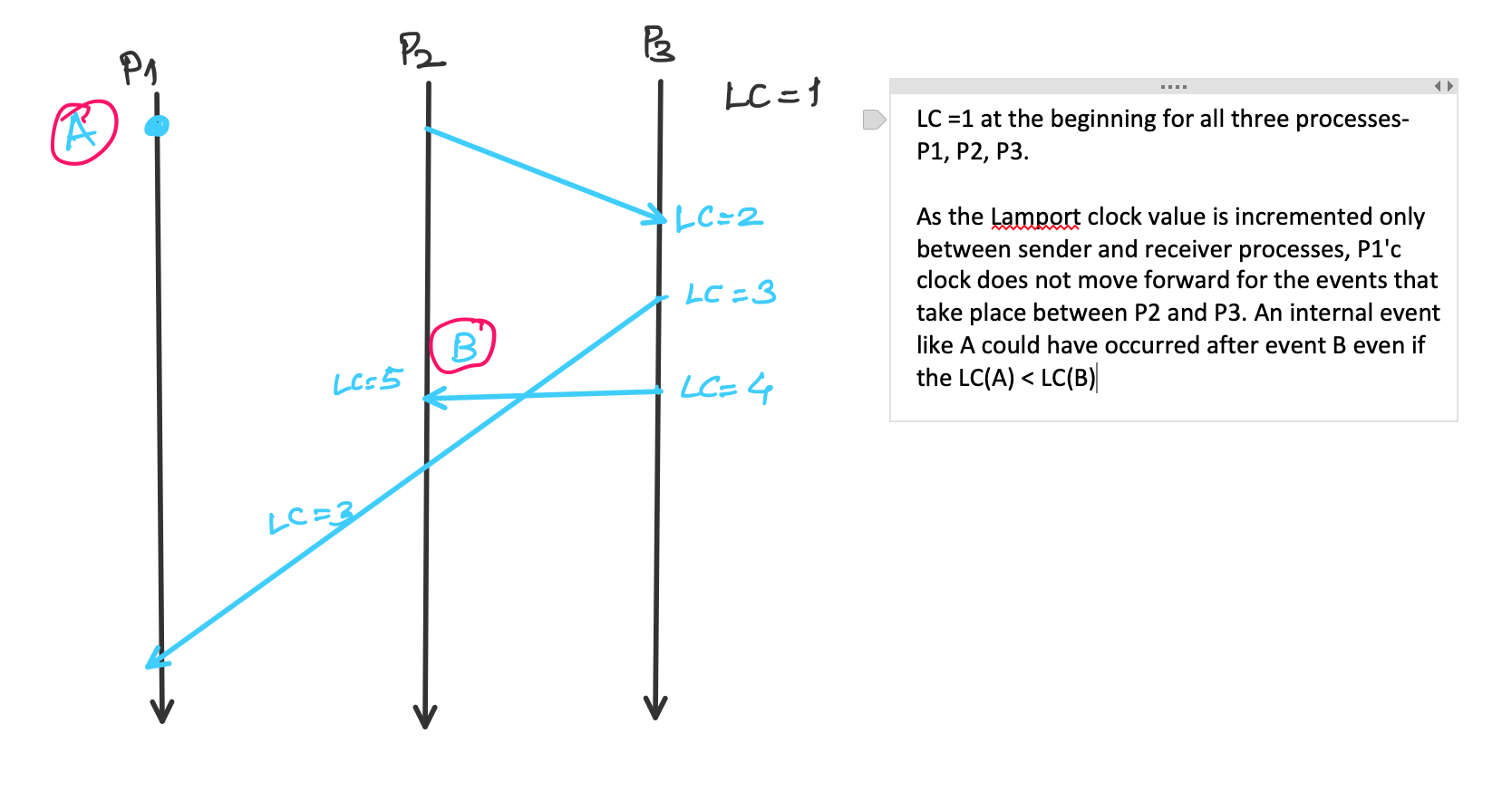 In the area of logical clocks, Lamport clocks are the first. They are simpler and help in partial ordering. But they are useful only so much. For example, we can say that if A happened before B, then Lamport clock of A- denoted here as LC(A)- would be less than LC(B); but we can not for certain say that if LC(A) < LC(B) then A necessarily happened before B. Here I will not detail out the mechanism of how the clock values are sent, used, incremented. It should be apparent from the diagram below. Even if it’s not, let’s move on to vector clocks.