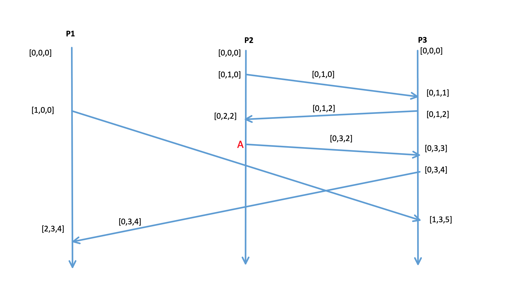 If there is an event that has a VC with some positions as same or more and other positions smaller than VC(A), then that event is independent of A. So in above picture, the first event on process P1- which has VC [1,0,0] cannot be on the causal history nor can it be an effect of the event A. It is independent of A.